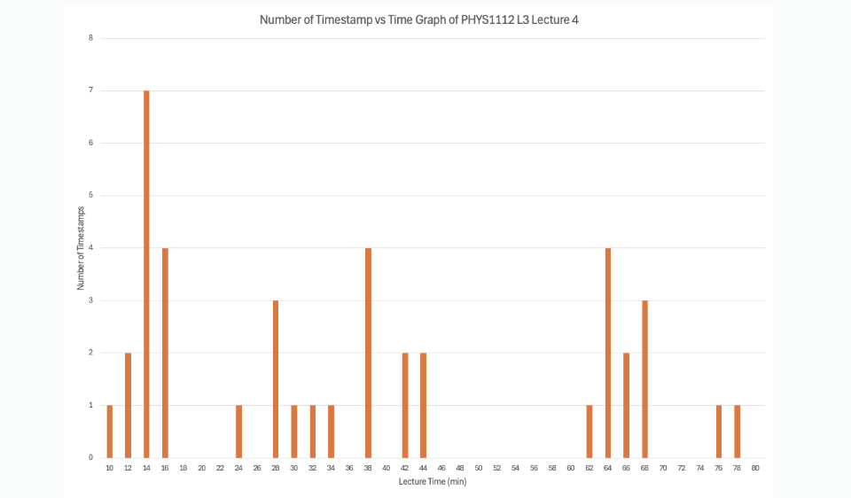 PHYS1112 第三堂課的整體分佈廣泛,表明學生對不同主題感到困惑。個人化的暫存筆記能滿足這些個別需求,而顯著的峰值則凸顯出教授可以特別針對的常見問題。