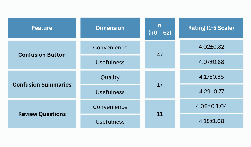StashTag 的試行計畫在關鍵領域展現了清晰、積極的影響:在不干擾教學的前提下,將轉瞬即逝的困惑轉化為及時的清晰理解。在一學期涵蓋 59 堂課與 487 名學生的實施過程中,積極使用者對「暫存按鈕」的實用性(平均 4.07/5)與便利性(平均 4.02/5)給予高度評價。在使用過 AI 生成的「暫存筆記」的學生中,對其感知品質(平均 4.17/5)、實用性(平均 4.29/5)和便利性(平均 4.13/5)的評價均十分強勁,許多人指出摘要能「將教材濃縮為重點以供快速複習」,並有助於「回顧不確定的領域」。伴隨這些摘要的複習問題在品質(平均 4.25/5)、便利性(平均 4.09/5)和實用性(平均 4.18/5)方面也獲得了同樣的高分,強化了 StashTag 既能解釋概念,又能幫助學生主動檢驗理解的能力。
