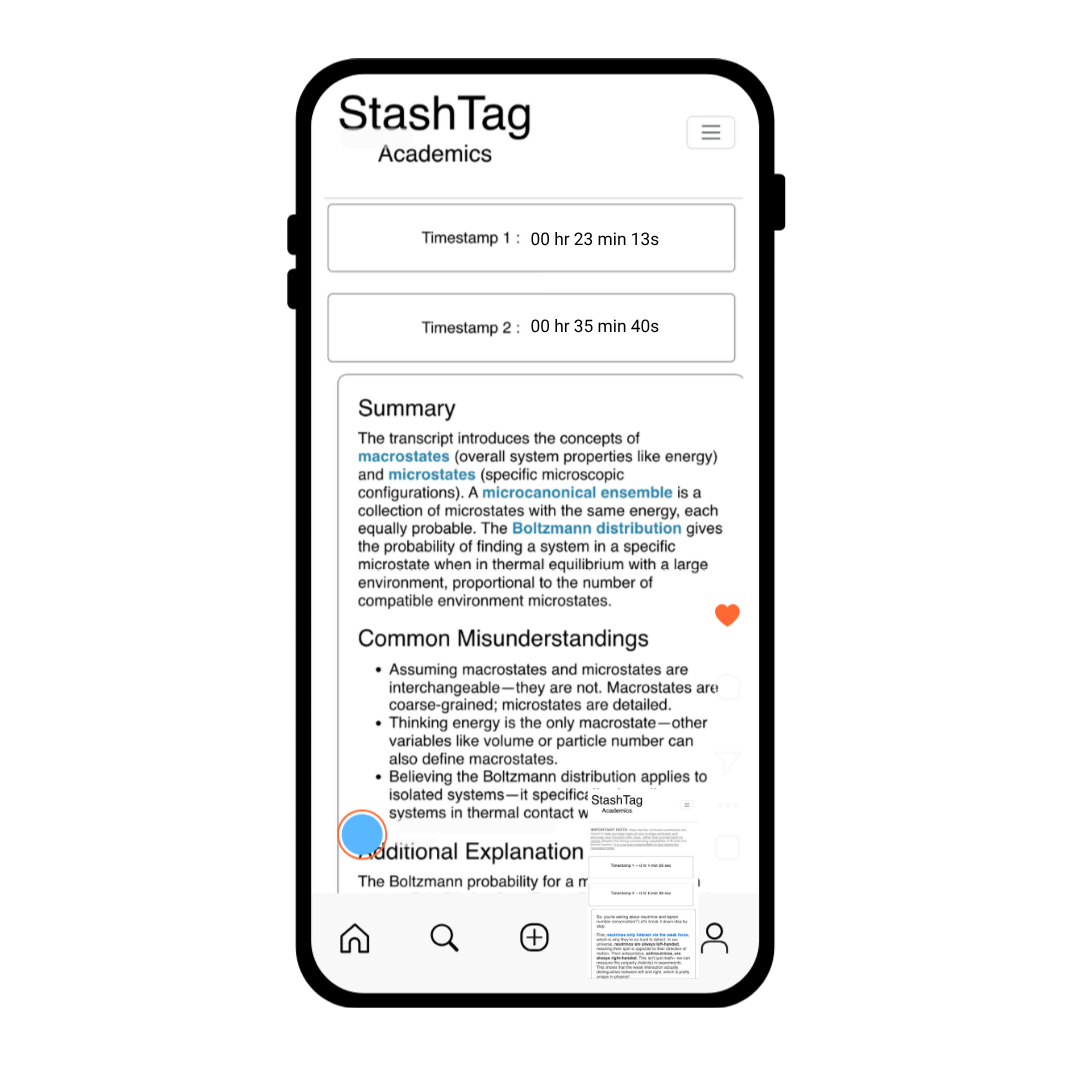 StashTag is a learning enhancement tool that addresses the problem of "confusion accumulation" faced by students when grappling with abstract concepts or mathematical principles. By storing moments of confusion as timestamps during class, it utilizes AI to generate thorough explanations that reference the content taught at those specific times. Our goal is to help students keep track of their confusion so they can easily identify gaps in their understanding.